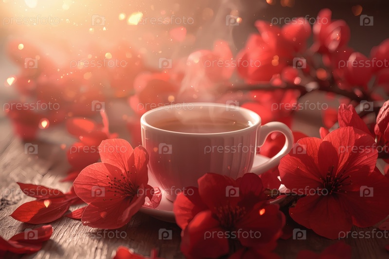 Чашка горячего кофе или чая, окруженная красными цветами и сердцами в День святого Валентина