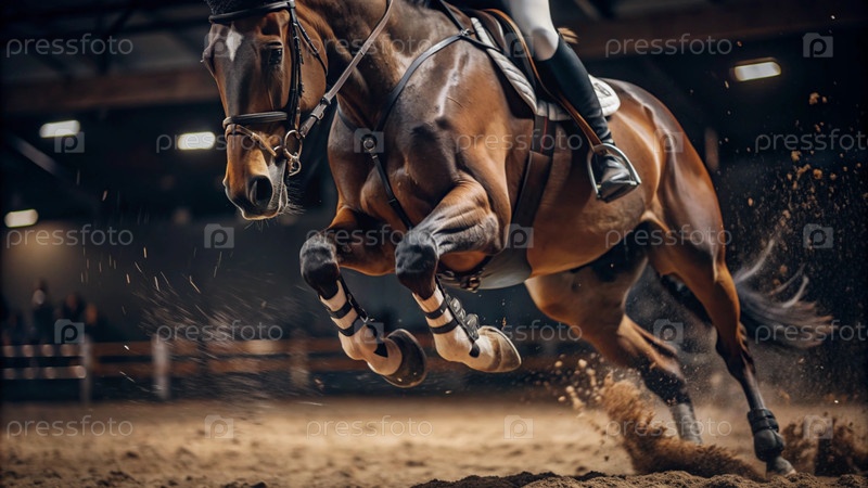 Близкий план олимпийской лошади и всадника, перепрыгивающих через препятствие на открытой арене - это конная езда