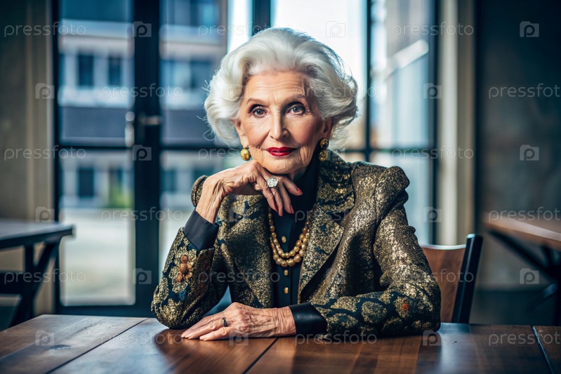 Минимализм.Студийный портрет стильной, элегантной пожилой женщины, 70-летнего пенсионера в интерьере и одежде спокойных тонов.Концепция пожилых людей