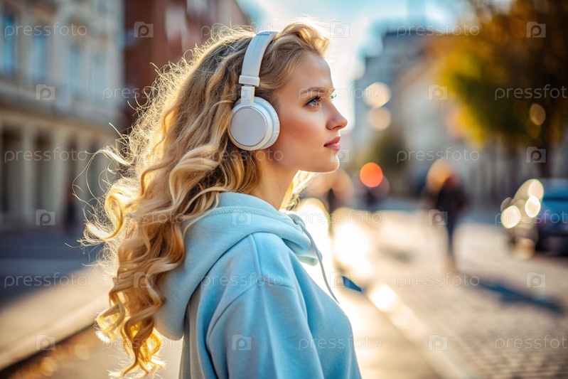 Молодая красивая кудрявая женщина слушает музыку с наушниками на вечерней улице города при закате солнца.Мир, гармония, отдых и расслабление