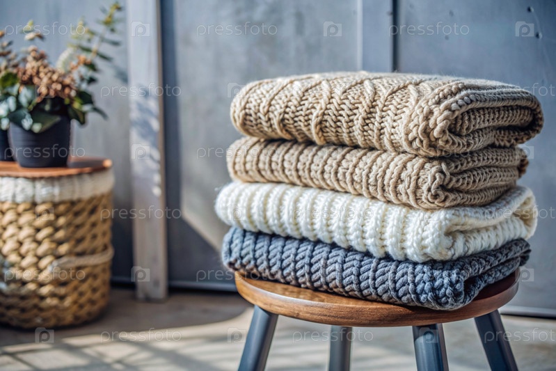 Близко, вяжу тёплую одежду на деревянном стуле в комнате.Зимний сезон, малый бизнес, ручная одежда