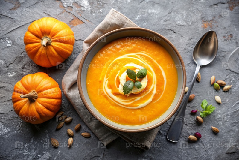 Традиционный мягкий тыквенный кремовый суп с сливками и семьями тыквы на сером бетонном фоне