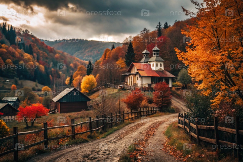 Осенний пейзаж. Небольшая уютная церковь в деревне. Деревья окрашены в яркие осенние цвета. Атмосфера мира и гармонии с природой