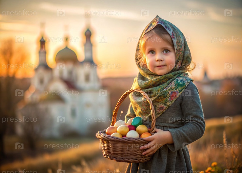 Счастливая Пасха. Христианство. Портрет трехлетней девочки в русском народном шале с плетеновой корзиной с пасхальными яйцами в руках на фоне православного храма