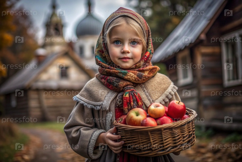 Красивая девушка в русской национальной одежде с корзиной спелых красных яблок на фоне православного храма