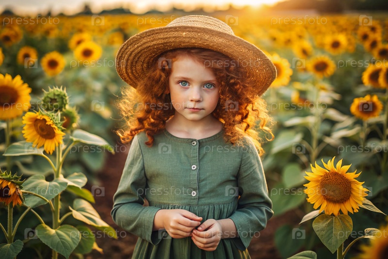 Портрет красивой кудрявой девушки в соломенной шляпе и зеленом платье на цветущем поле подсолнечника Детство