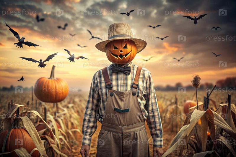 Концепция Хэллоуина. Ужасная. Страх. Устрашающий богий с тыквенной головой, квадратной рубашкой и бабочкой. Баннер, открытка