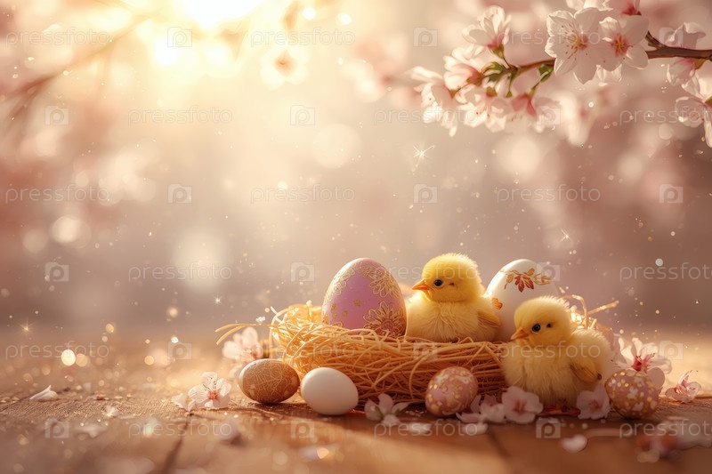 Концепция яркого Пасхального праздника. Нежные розовые пасхальные яйца, желтые курицы и вишневые ветви на деревянном фоне. Концепция ярких пасхальных праздников в 2026 году