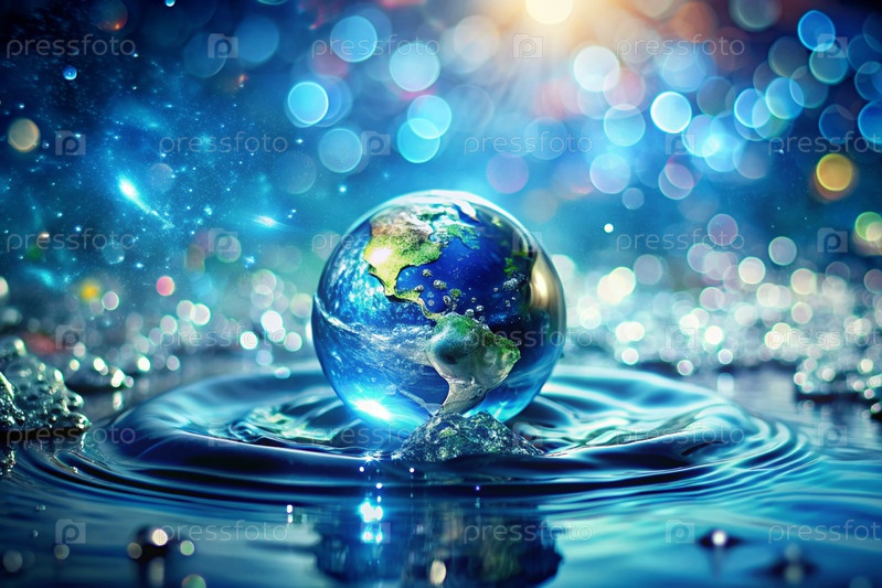 Концепция праздника - Всемирный день воды и День Земли.Планета Земля находится в чистой воде с капельками и брызгами.Красивый боке
