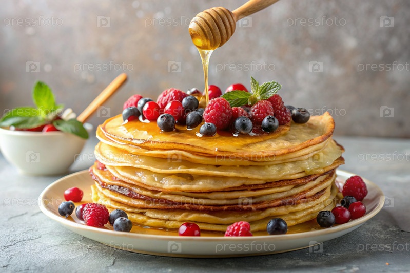 Вкусные блины с медом, ягодами, чернилами, клюквами и малиной.Концепция российского праздника Масленица