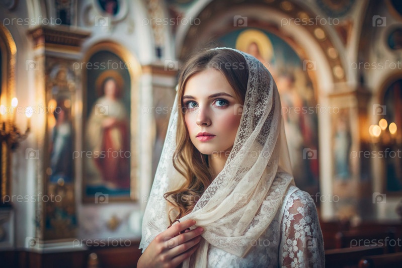 Портрет красивой молодой женщины с платками в православной церкви.Девушка молится в церкви среди икон