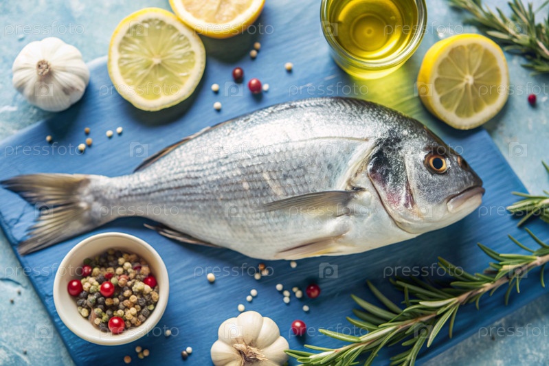 Вкусная и здоровая рыба. сырой дорадо с лимоном и ингредиентами на темном фоне. баннер, меню, место для текста рецепта, верхний вид