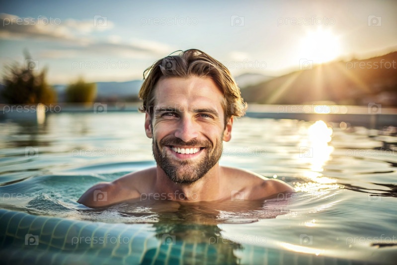 Красивый молодой человек плавает и тренируется в отопительном бассейне, счастливая улыбающаяся девушка