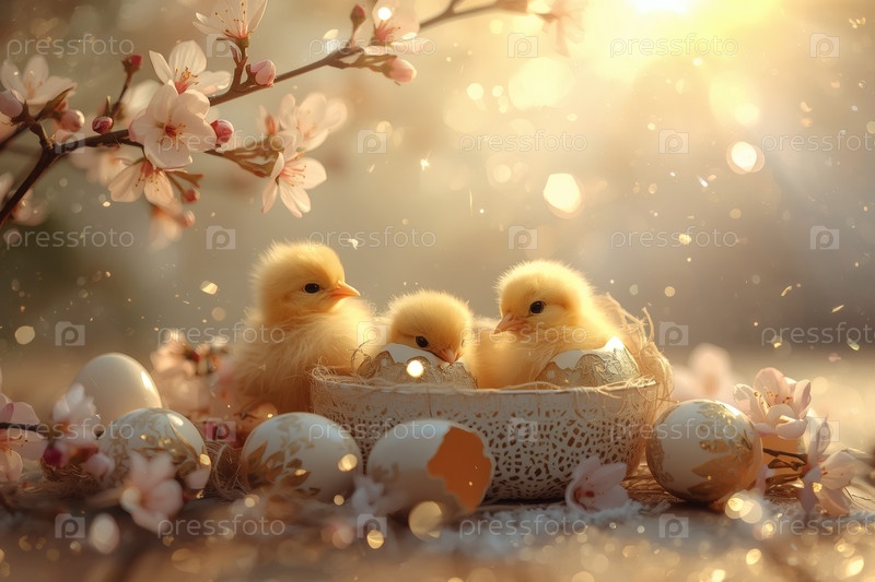 Концепция яркого Пасхального праздника. Нежные розовые пасхальные яйца, желтые курицы и вишневые ветви на деревянном фоне. Концепция ярких пасхальных праздников в 2026 году