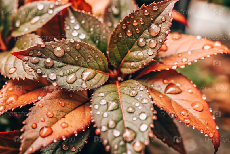 Макрографический крупный план красно-зеленых листьев, капли воды на листьях