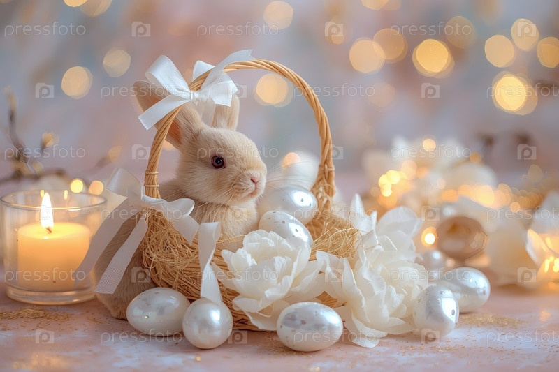 Концепция счастливых пасхальных праздников: нежные жемчужинные яйца в корзине, кролик и деликатные цветы на пастельном фоне