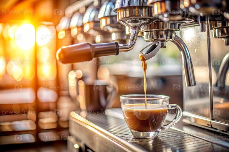 Свежеваренный кофе, заливаемый из кофейной машины на размытом фоне кафе или ресторана