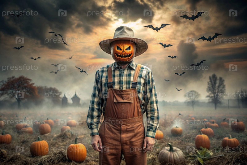 Концепция Хэллоуина. Ужасная. Страх. Устрашающий богий с тыквенной головой, квадратной рубашкой и бабочкой. Баннер, открытка