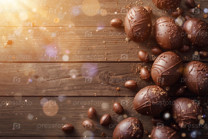 Концепция ярких пасхальных праздников в 2026 году. Хорошая открытка. Баннер. Шоколадные пасхальные яйца на деревянном фоне. Пасхальные сладости и лакомства