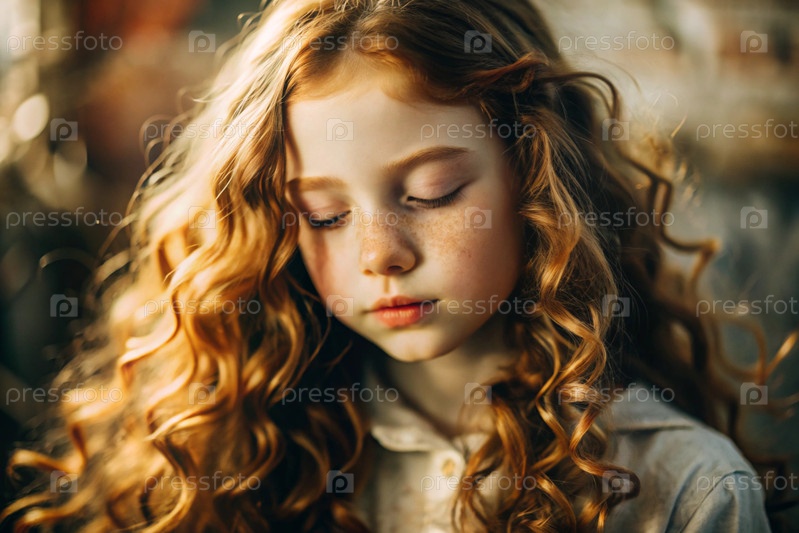 Портрет красивой маленькой рыжеволосой девочки с длинными волнистыми волосами и задумчивым взглядом.Власы развиваются и создают ощущение легкости и естественности