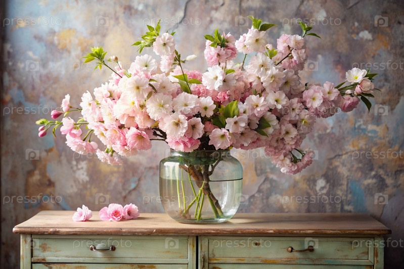 Красивая ветвь розовой вишни в стеклянной вазе и флаконы на древнем деревянном шкафу. Букет цветов в вазе во внутренней части дома. Светлый, бежевый, розовый цветочный фон