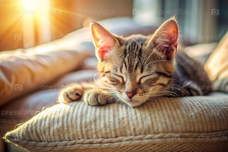 Милый котенок спит на подушке у окна.Кот удобно расположился в своем любимом месте, чтобы отдохнуть под солнцем