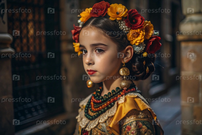 Испанская девушка в традиционном испанском национальном костюме. Перед быком. Бикоборство. Портрет символизирует традиции и культуру народа Испании