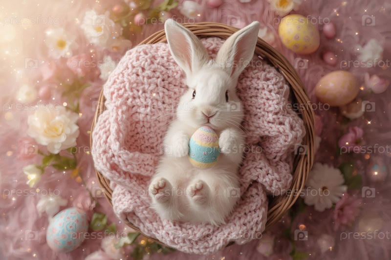 Пасхальный кролик пасхальное яйцо в лапах, лежащее на спине на сером вязанном одеяле в корзине из колючки и уставившееся в камеру