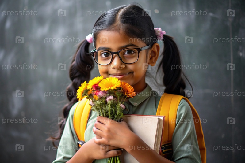 Красивая первоклассница с очками и коньими хвостами на голове. Букет осенних цветов. Ребенок впервые идет в школу. Ребёнок с рюкзаком, книгой и цветами. Возвращение в школу