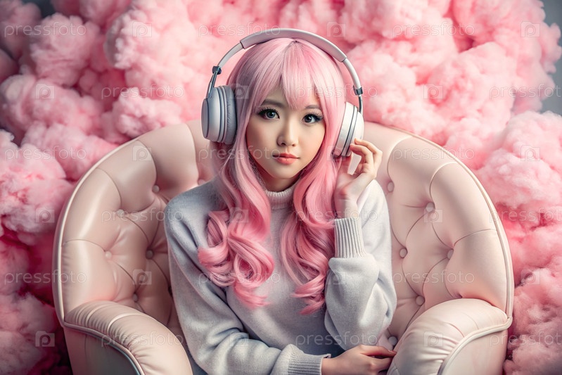 Молодая красивая японская девушка с розовыми волосами в аниме слушает музыку на беспроводных наушниках в розовых облаках