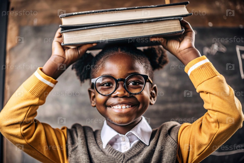 Красивая афроамериканская девушка с очками и книгами. Ребенок впервые ходит в школу. Ребёнок в классе с доской