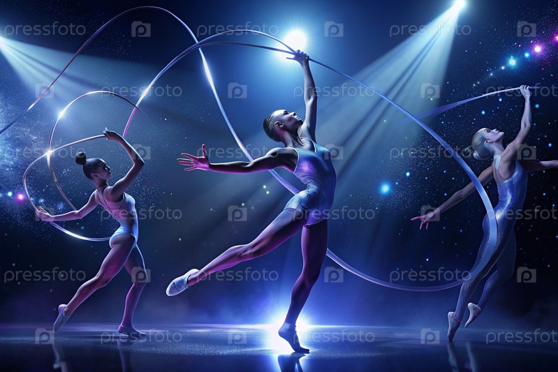 Ритмическая гимнастика - это крупный план красивой гимнастки с лентой в центре внимания на спортивной арене