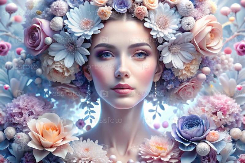 Международный женский день. баннер, флаер. весенний портрет красивой женщины с венок цветов на голове в нежных синих и розовых цветах