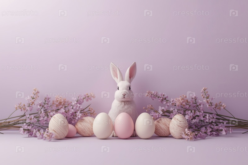 Счастливая Пасха 2026, минималистическое студийное фото. пасхальный кролик, пасхальные яйца и нежные весенние цветы. мягкое освещение студии создает ощущение чистоты и воздушности