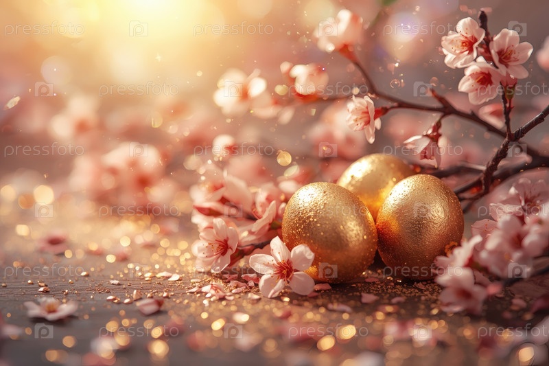 Концепция яркого пасхального праздника в 2026 году.Нежные розовые пасхальные яйца и вишневые ветви на деревянном фоне