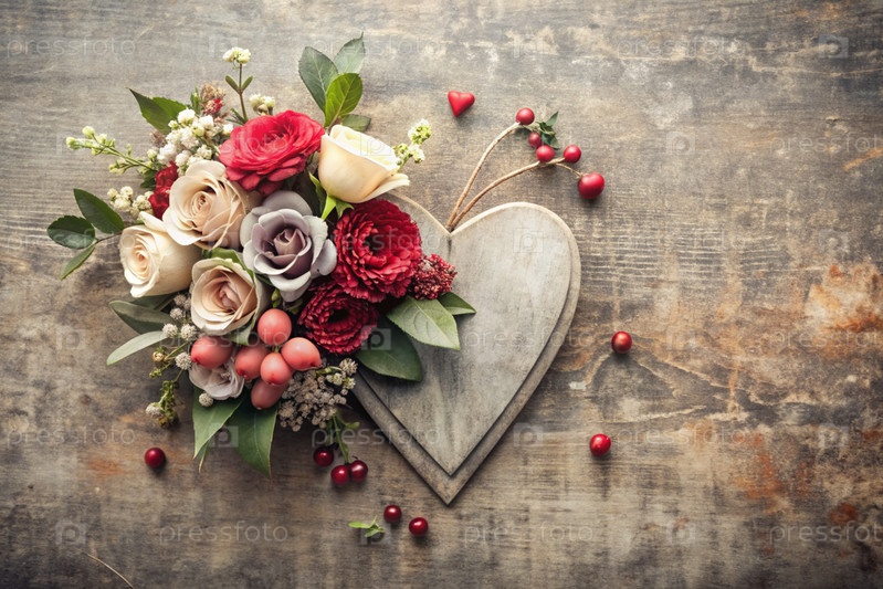 Открытка, баннер Дня матери с красными цветами, сердца на винтажном сером деревянном фоне