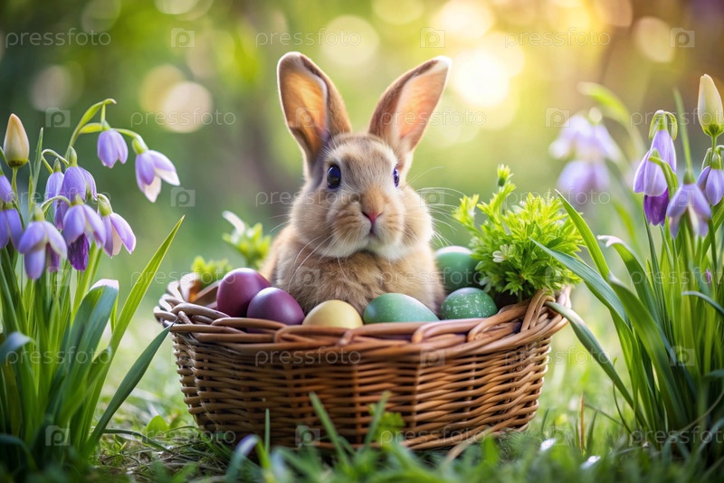 Баннер. пасхальный кролик в корзине из красочных пасхальных яиц вокруг весенних снегопадов и первичной розы. концепция праздника Пасхи