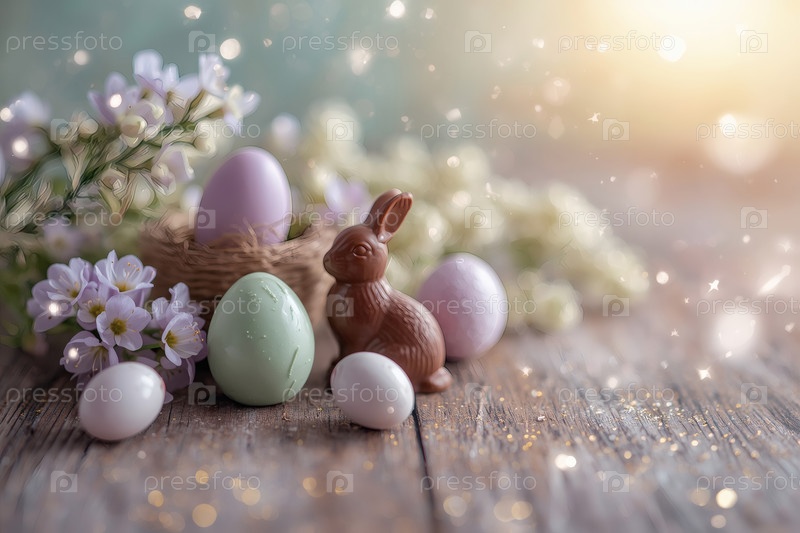 Пасхальные сладости и лакомства. Концепция ярких пасхальных праздников в 2026 году. Хорошая открытка. Баннер. Шоколадные пасхальные яйца, шоколадный кролик и весенние цветы на деревянном фоне
