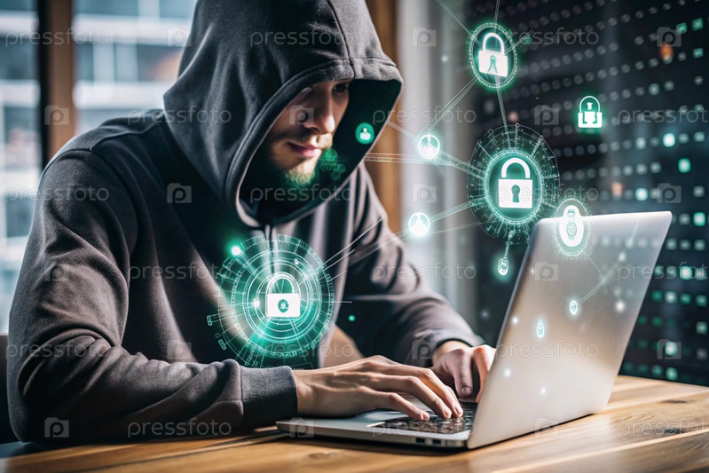 Хакер работает на ноутбуке, цифровые коды на виртуальном фоне. взлом и защита онлайн-данных. цифровые технологии, разработка программного обеспечения