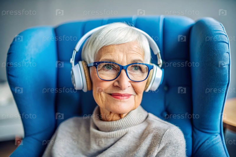 Стильная, современная, счастливая 60-70-летняя женщина слушает музыку в больших беспроводных наушниках дома, на стуле в гостиной