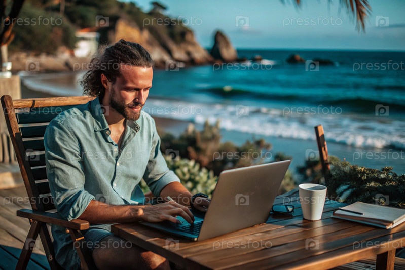 Молодой бизнесмен-фрилансер работает на ноутбуке, отдыхая у моря или делая покупки в Интернете