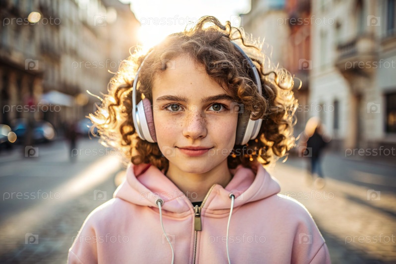 Молодая красивая кудрявая женщина слушает музыку с наушниками на вечерней улице города при закате солнца.Мир, гармония, отдых и расслабление
