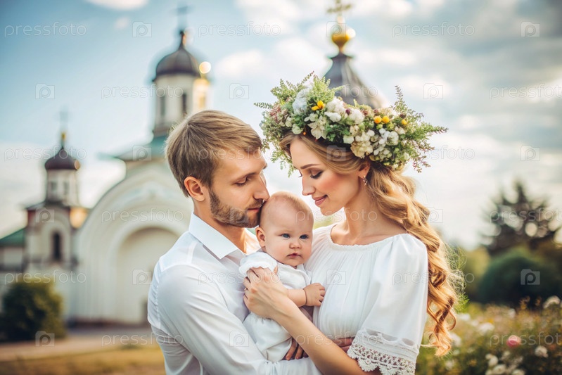 Всероссийский день семьи, любви, верности мужчина и женщина с ромашками с ребенком в руках на фоне православной церкви День святого Валентина Петра и Февронии