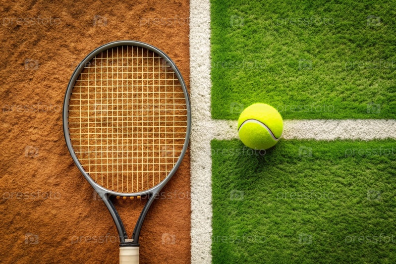 На лужайке жёлтый теннисный мяч и теннисная ракетка, летний вид спорта