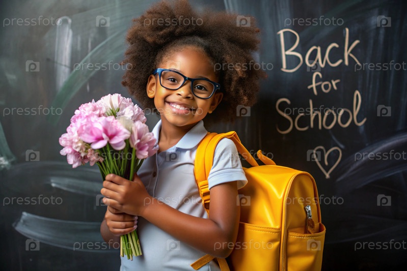 Чернокожая африканская девочка - первоклассница, которая носит очки. Букет цветов. Ребенок впервые ходит в школу. Ребёнок с рюкзаком, книгой и цветами. Возвращение к школе