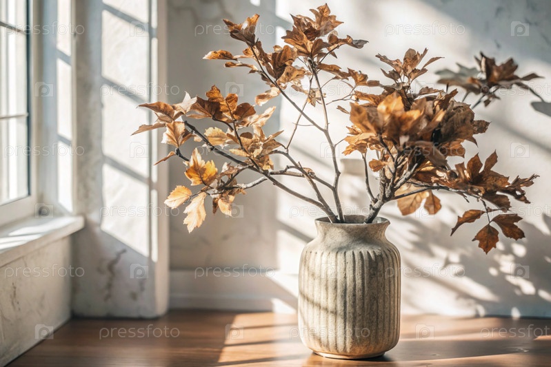 Ветви с золотыми осенними листьями в керамической вазе на деревянном столе у окна. Концепция домашнего комфорта. Осенний декор для Хэллоуина