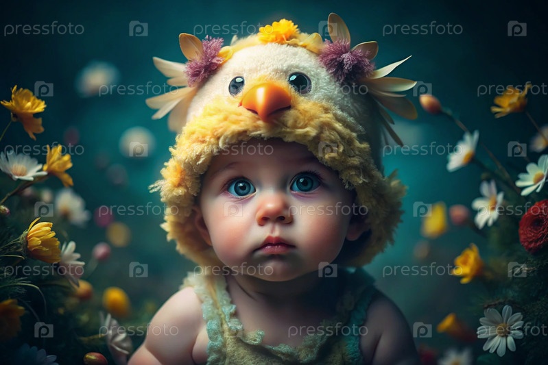 Баннер. Винтажная открытка. Мальчик, одетый в пасхальную желтую курицу. Концепция праздника Bright Easter Spring