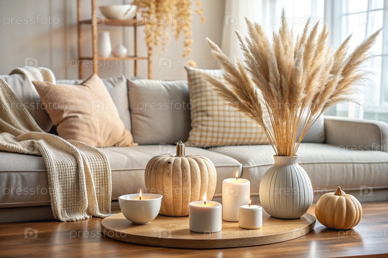 Современная белая керамическая ваза с сухой травой, свечами на деревянном столе и тыквами Скандинавский интерьер Концепция осеннего декора и комфорта в доме