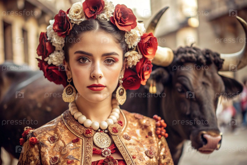 Испанская девушка в традиционном испанском национальном костюме. Перед быком. Бикоборство. Портрет символизирует традиции и культуру народа Испании