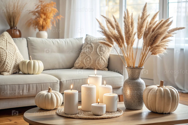 Современная белая керамическая ваза с сухой травой, свечами на деревянном столе и тыквами Скандинавский интерьер Концепция осеннего декора и комфорта в доме